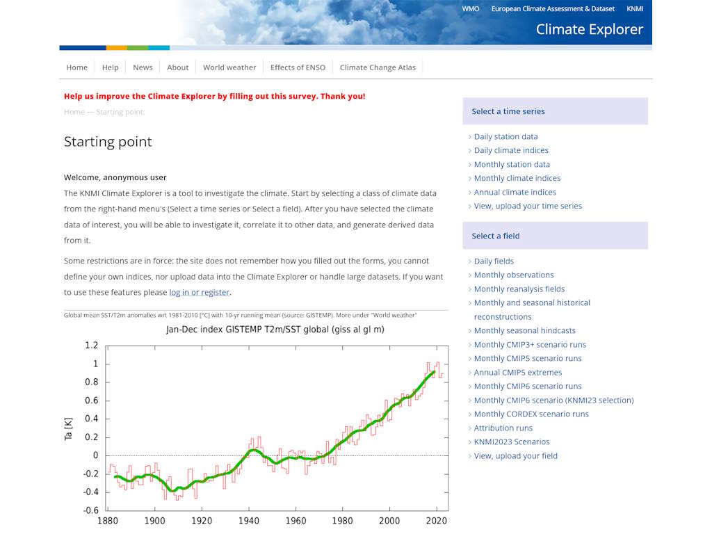 De KNMI Climate Explorer is een tool om het klimaat te onderzoeken. Begin door een klasse van klimaatgegevens te selecteren uit de menu's aan de rechterkant (Selecteer een tijdreeks of Selecteer een veld). Nadat je de gewenste klimaatgegevens hebt geselecteerd, kun je deze onderzoeken, correlaties maken met andere gegevens en afgeleide gegevens genereren.